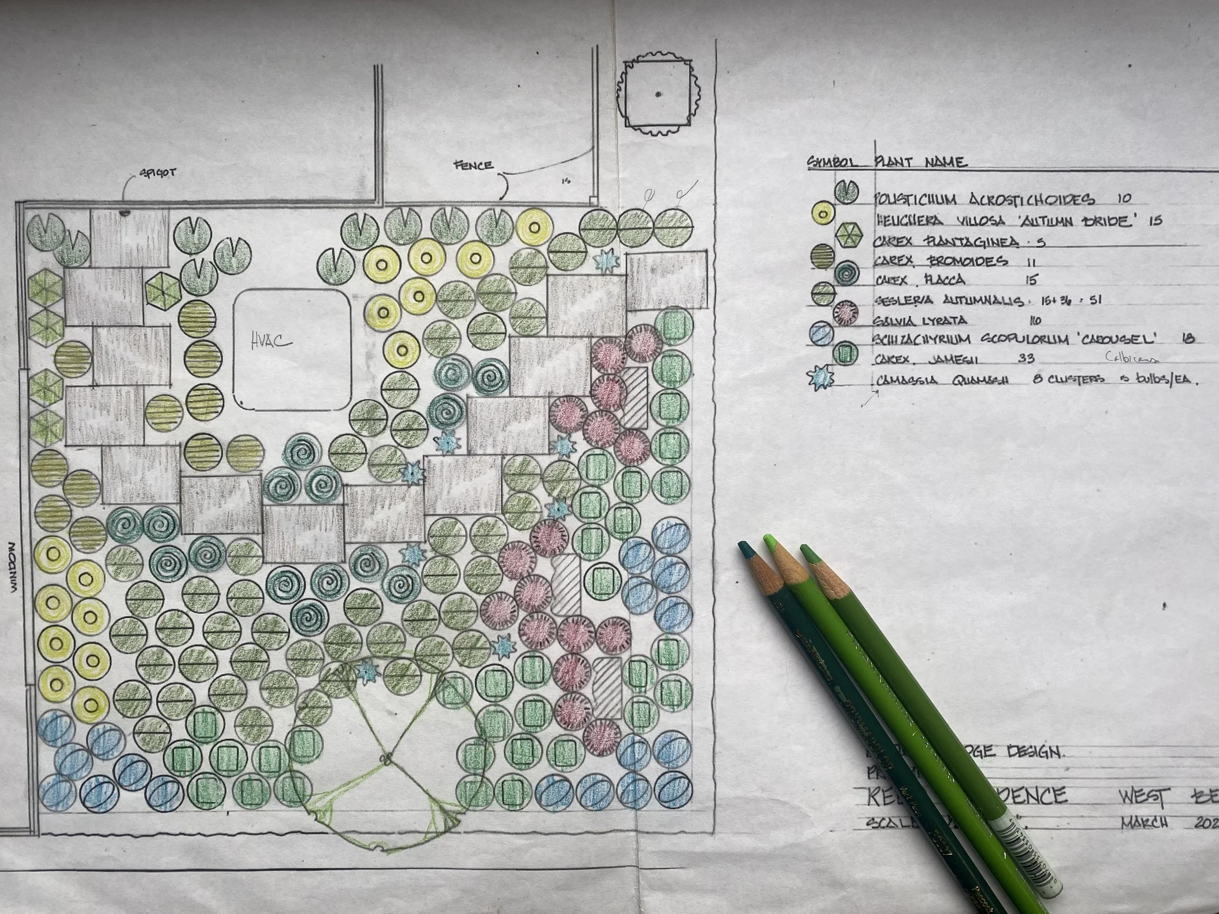 The design process includes assessment of existing amenities opportunities and limitations. In this location, an existing HVAC unit could not be moved. Collaboration with this homeowner led to a richly textured, low maintenance garden of grasslike species, in keeping with their preference for Japanese inspired design. The design was drawn to scale; plants were identified by Latin and Common Name, size and quantity. Procured and installed by a trusted contractor, the plantings provide a striking alternative to traditional foundation plantings.